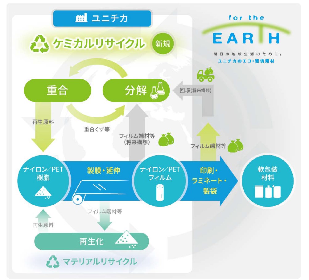 環境配慮型食品包装用ナイロンフィルム「エンブレムCE」やポリエステルフィルム「エンブレットCE」で用いられたようなケミカルリサイクル技術は、プラスチック資源の有効利用の観点から、今後ますます重要になってくるものと考えられます。当社は、今回ご紹介した環境配慮型の素材開発による事業展開をさらに加速させ、持続可能な社会の実現に向けて積極的に貢献して参ります。